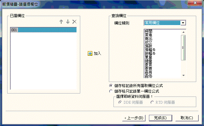 - 點選主功能列中”功能/輸出到Excel/報價精靈”,系統隨即出現對話精靈,以進行設定。使用者可直接從”代碼/名稱”處直接輸入,或者利用上方的”市場/類別”來挑選,”產業/組合”內的選單會因選定的”市場/類別”而變動。