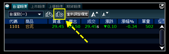 從自選報價中的工具列來調整自選股清單