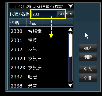 在輸入區輸入部份股號,下方顯示區會列示出符合模糊搜尋的個股。