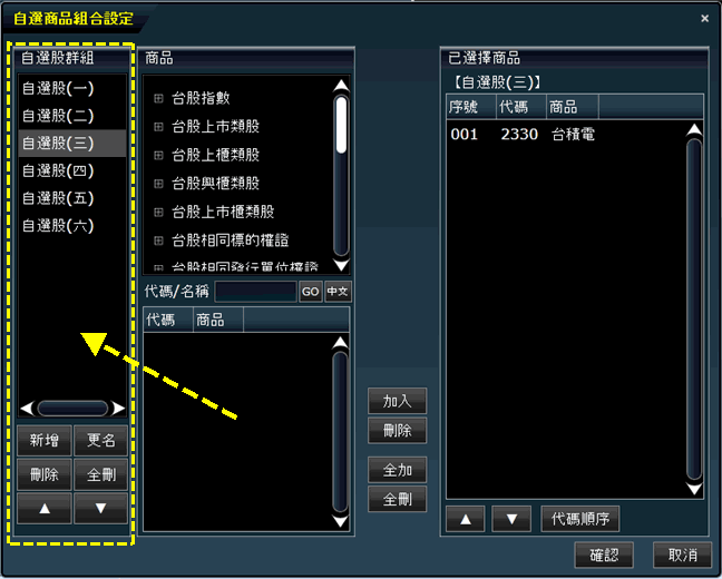 點擊工具列上"編輯商品組合",會出現對話盒,讓用戶針對目前的自選股組合來編輯商品清單。