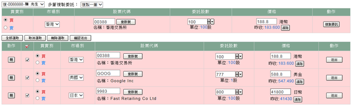 可將上方下單列所選擇的委託內容複製至下方的多筆下單列中。 |