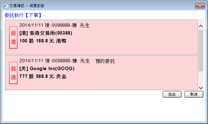 以滑鼠左鍵點擊( )按鈕,會彈出「交易確認」視窗如下圖,按下〔確認送出〕鈕,即可送出委託; |
