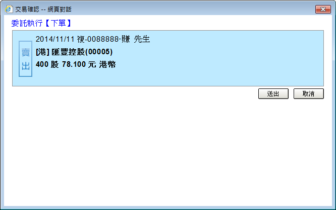 以滑鼠左鍵點擊( )按鈕,會彈出「交易確認」視窗如下圖,按下〔確認送出〕鈕,即可送出委託; |