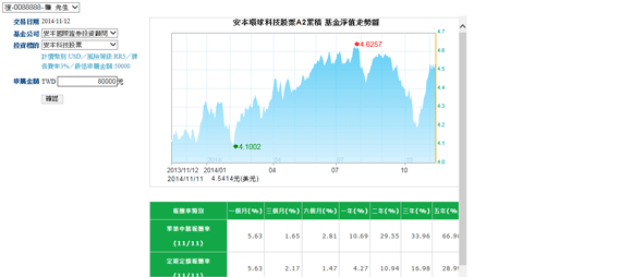 選擇欲申購的基金公司及基金名稱,輸入申購金額,點選確認後即可進行申購。
