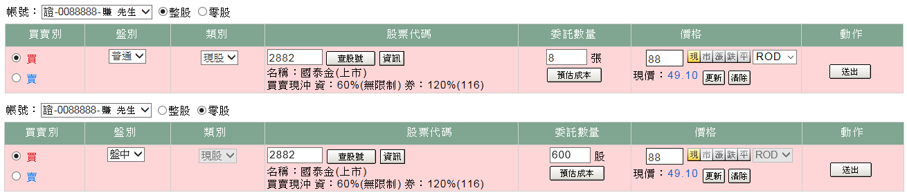 ROD(當日有效委託):委託後無法一次成交,此筆委託單不會取消,會留至收盤為止。 |