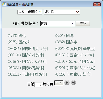 ,按下〔查詢〕按鈕,系統會進行模糊搜尋,搜尋出相關的股票名稱。 |