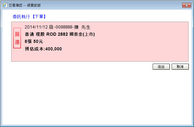 以滑鼠左鍵點擊( )按鈕,會彈出「交易確認」視窗如下圖,按下〔確認送出〕鈕,即可送出委託; |
