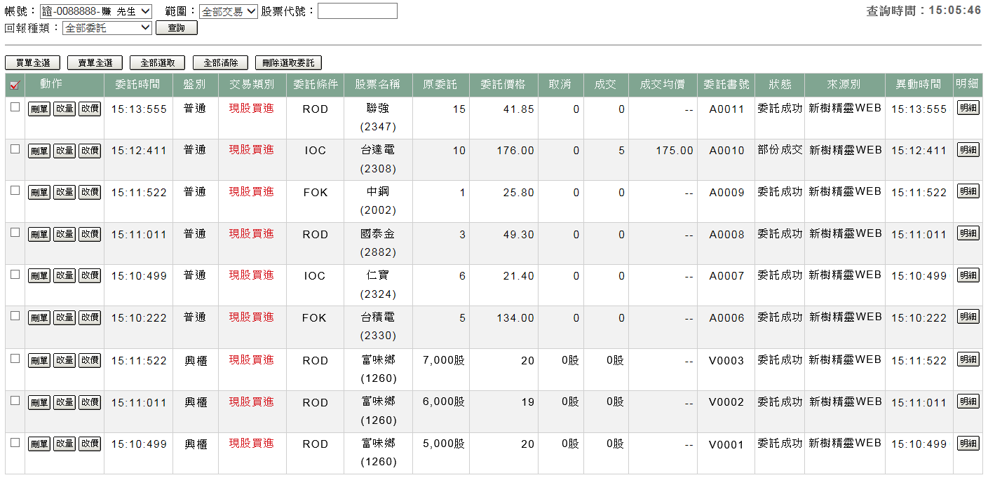 ( )由下拉式選單選擇查詢「全部委託」、「未完全成交委託」、「完全成交委託」、「委託失敗」選項。 |