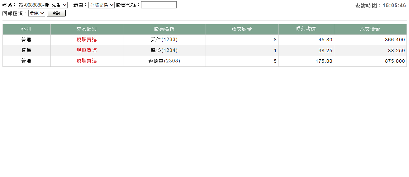 點選系統的〔證券交易〕按鈕,再點選〔成交回報〕標籤。