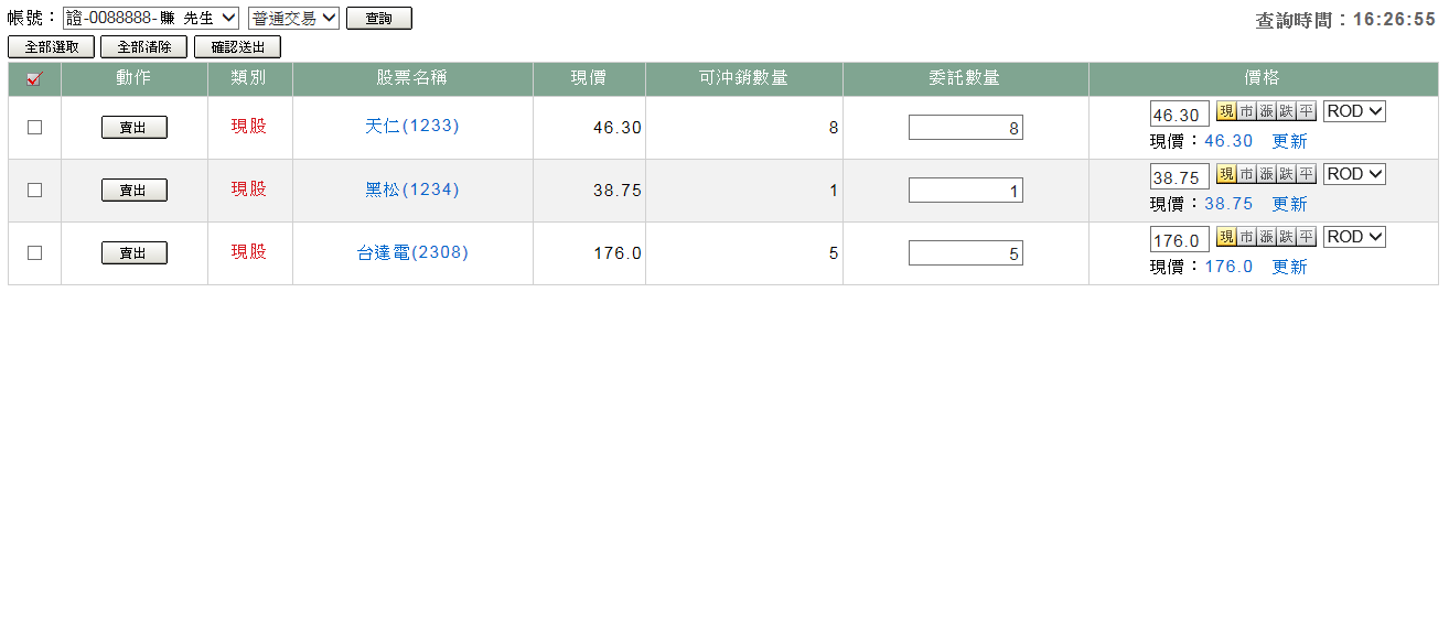 在「數量」欄位的( )輸入委託數量,系統預設值為可以委託賣出的庫存數量。 |