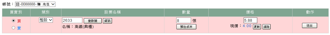 以滑鼠左鍵點擊「清除」,系統會清除所輸入的「委託數量」及「價格」。 |