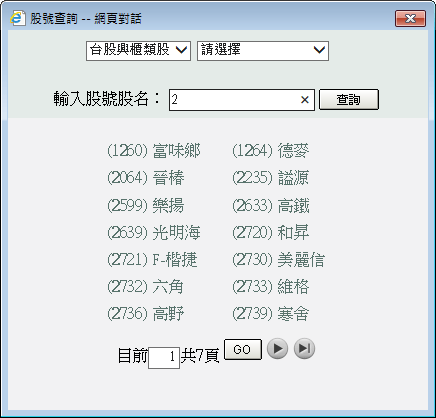 ,按下〔查詢〕按鈕,系統會進行模糊搜尋,搜尋出相關的股票名稱。 |