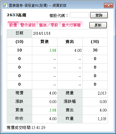以滑鼠左鍵點擊「更新」,系統會更新所顯示的「現價」; |