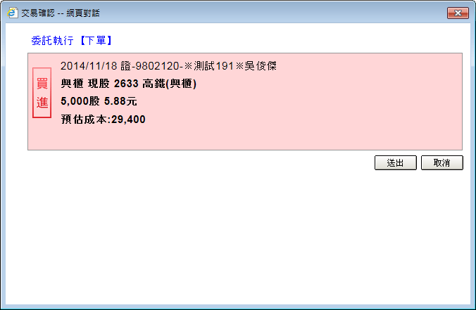 以滑鼠左鍵點擊( )按鈕,會彈出「交易確認」視窗如下圖,按下〔確認送出〕鈕,即可送出委託; |