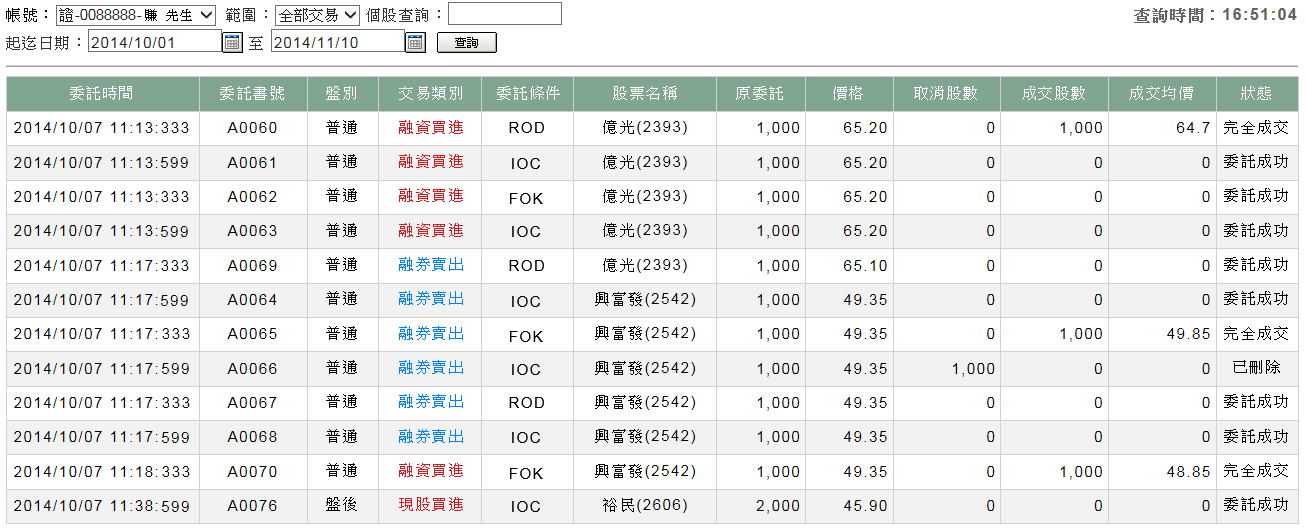 點選系統的〔證券帳務〕按鈕,再點選〔歷史委託〕標籤。