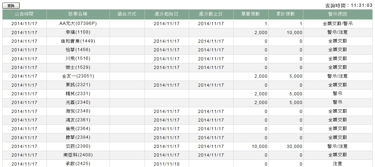 點選系統的〔證券帳務〕按鈕,再點選〔警示股〕標籤。