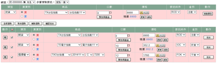)按鈕, 可將上方下單列所選擇的委託內容複製至下方的多筆下單列中。