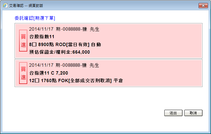 )按鈕,會彈出「交易確認」視窗如下圖,按下〔送出〕鈕,即可送出委託;