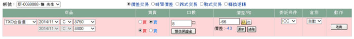 以滑鼠左鍵點擊「清除」,系統會清除所輸入的「口數」及「價差/和」。 |