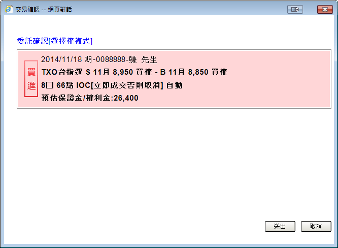 以滑鼠左鍵點擊( )按鈕,會彈出「交易確認」視窗如下圖,按下〔確認送出〕鈕,即可送出委託; |