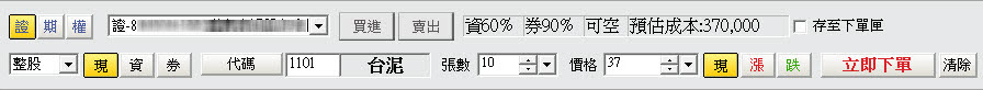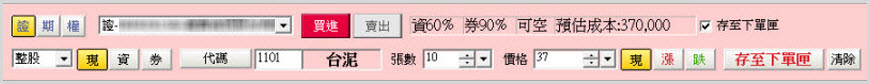 - 下方主要功能項,由左而右依序為:盤別、現資券、商品選擇、張數、價格設定、動作按鈕。