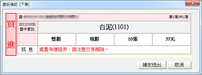 - 填入所有下單條件後,按下立即下單會跳出下單確認視窗