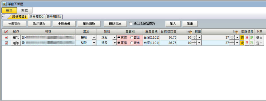 - 填入所有下單條件後,按下存至下單匣會將單子存到下單匣中