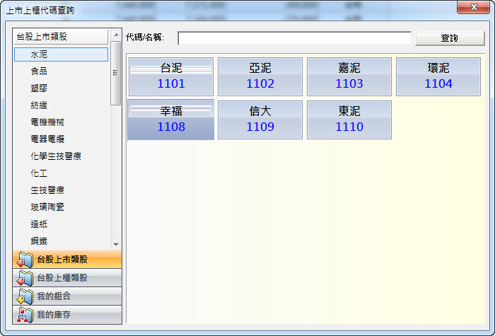 - 點選「代碼」按鈕後跳出上市上櫃代碼查詢視窗