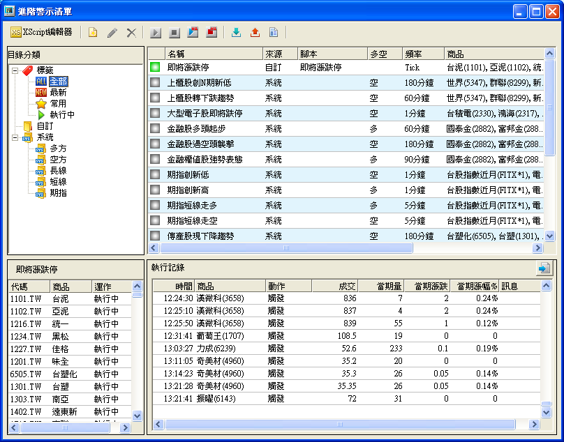 狀態區﹙左側﹚是顯示最新執行狀態,記錄區﹙右側﹚是顯示進階警示執行及觸發的記錄。 |