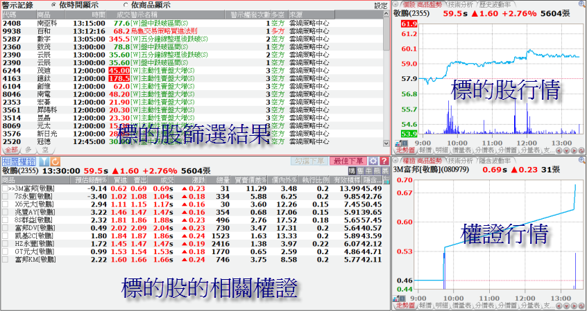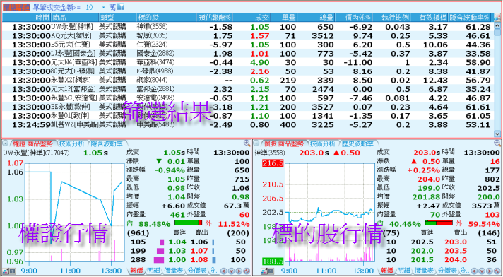 - 「極短線主力進出」:統計同標的權證(不限同一權證)1秒內同方向大單(單筆成交金額大於三萬)合計交易金額超過五十萬的標的股。