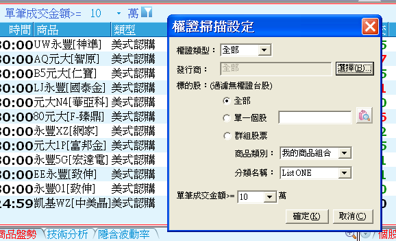 )可以指定結頁區權證要符合的條件,項目包括:權證類型、發行商(可以複選)、標的股類型,以及單筆成交金額。