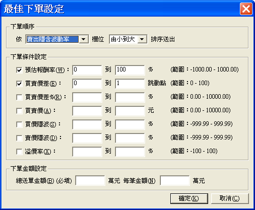 ):提供各種下單設定,設定完按確定,最佳下單即依此設定篩選符合商品。