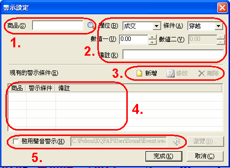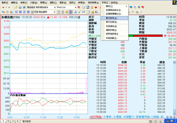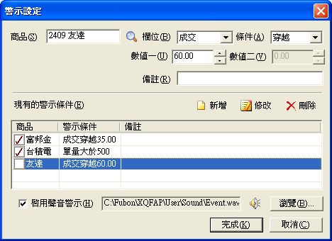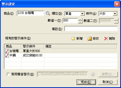 | 警示設定,是在商品價、量達到設定標準時,啟動警示訊息,提醒使用者,以避免遺漏重要訊號,確實掌握買賣點!