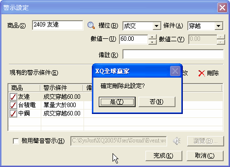 進入警示設定對話盒後,從現有警示條件方塊中選定要刪除的條件,按下[刪除]按鈕( ),會出現確認刪除的對話盒,確定刪除後,系統即會將該條件從現有警示條件方塊中移除! |