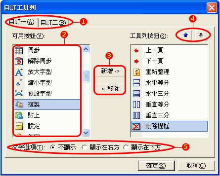 - 點選[新增]可將在可用按鈕中選定按鈕加入工具按鈕中;若欲刪除不想要的工具按鈕,可按[移除]將其刪除。