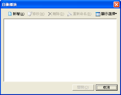 | 進入開啟自動播放對話盒後,點選要修改名稱的自動播放清單,然後點下[重新命名]按鈕,該組合名稱即會出現黑框,直接輸入新的名字,然後按鍵盤的[Enter]即完成修改名稱動作。 |