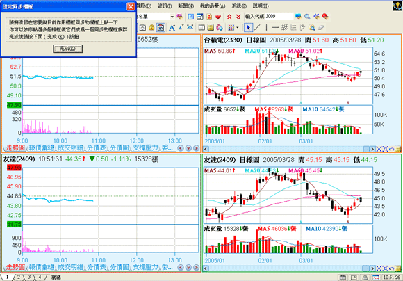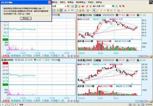 ),或選取主功能表中[編輯]中的[設定同步欄框],會出現一個對話盒,此時滑鼠游標圖形改變,讓使用者點選要同步的欄框,挑選完畢後按[完成]按鈕即可。使用者可依需求,自行設定多個不同的同步群組,屬於同一群組的欄框,欄框顏色會一致。重覆此步驟即可建立多組同步欄框。