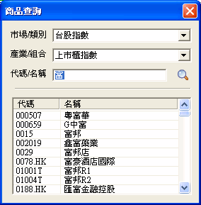 - 使用者自行輸入商品名稱或代碼後按[商品查詢]按鈕(