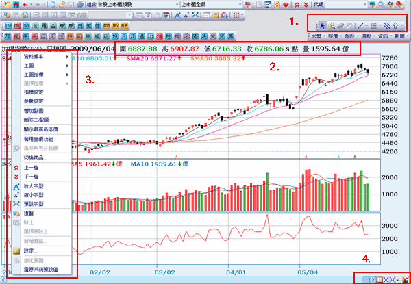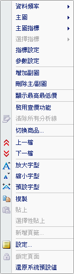 - 在畫面上按滑鼠右鍵,會出現功能選單,可以切換資料頻率、主圖類型、副圖類型等項目。
