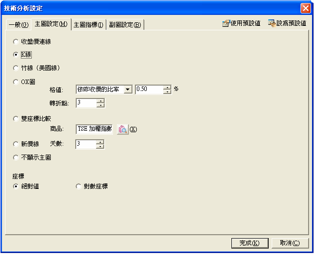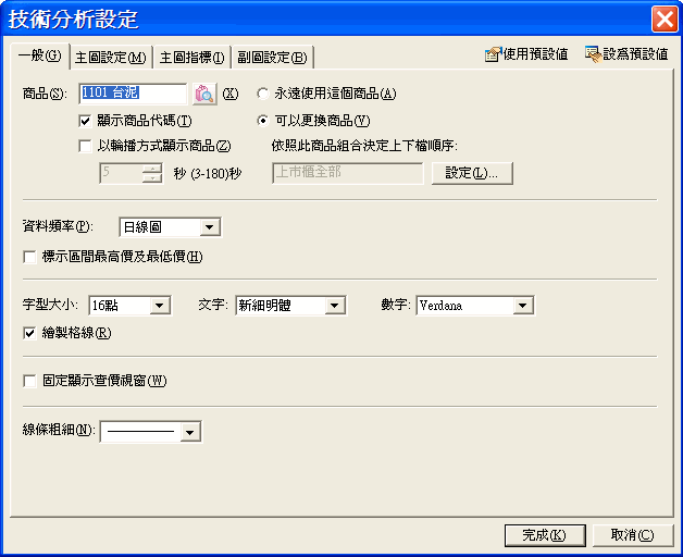 - 接著會跳出對話盒,相關設定分別列示在[一般]、[主圖設定]、[主圖指標]、[副圖設定]的Tab內,以供修改。