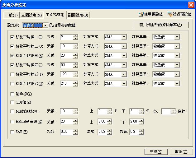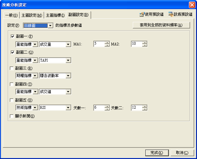 - 技術指標︰可選取與價有關的指標。打勾者,表示為目前的設定值。