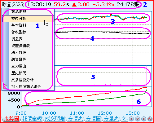 - 商品分時走勢圖,可依據較前一價為漲或跌或持平,以三種顏色分別標示,也可僅以單一顏色呈現。