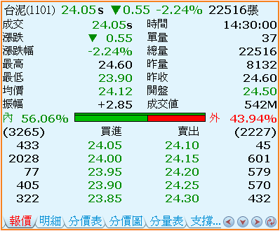 - 表示最佳買賣五檔資訊。以上圖為例,最佳買進的五檔價位分別為:24.05、24.00、23.95、23.90、23.85,而每個價位相對應的委買量分別為:433張、2028張、77張、405張、322張,共計最佳五檔價位的總委買量是3265張。