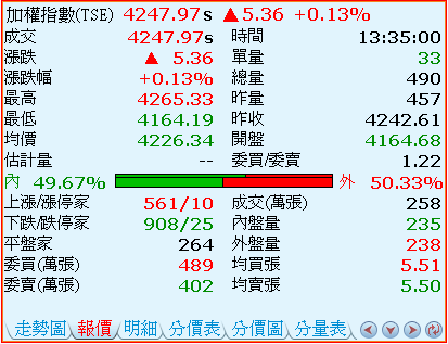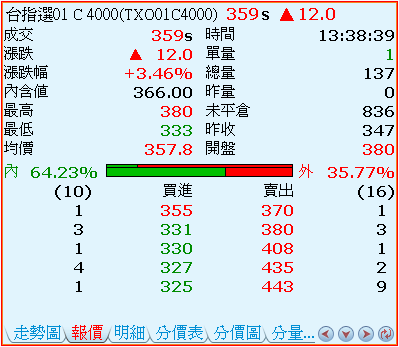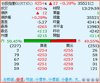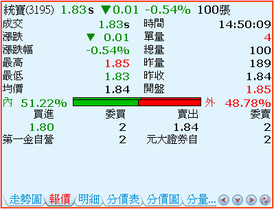 - 內外盤量之比:紅色代表外盤量的比率,綠色代表內盤量的比率。圖中較粗的柱狀,表示開盤迄今累計值的比例圖;而較細的柱狀,表示最近十五分鐘的累計數值比例圖。
