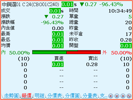 - 表示最佳買賣五檔資訊。以上圖為例,最佳買進的五檔價位分別為:0.01、--、--、--、--,而每個價位相對應的委買量分別為:10口、0口、0口、0口、0口,共計最佳五檔價位的總委買量是10口。