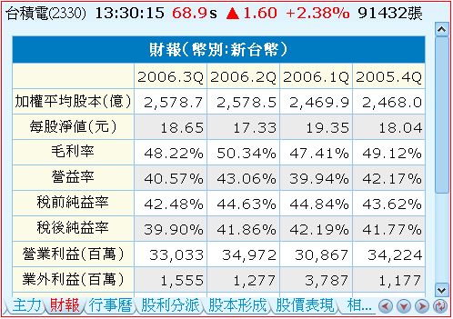 - 加權平均股本:股本是一家公司規模大小的指標。當公司仍處於小股本階段時,通常也代表著公司處於黃金的成長階段。而公司股本較大,則常代表著公司已於某一個產業取得領導地位。在另一方面,股本的大小代表著籌碼的多寡。籌碼少的股票具有安定的優點,而籌碼多的股票則具有流動性佳的優點。