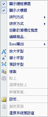 在報價組合內容上按滑鼠右鍵,會出現一快速切換選單,可以經由此選單,啟動輔助功能。