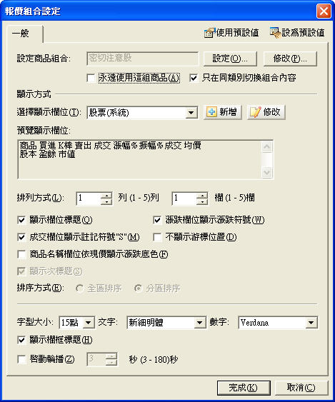 顯示欄位標題,若勾選,則會列示欄位表頭;漲跌欄位顯示漲跌符號,若勾選,在漲跌欄位數值前方會依上漲或下跌而顯示