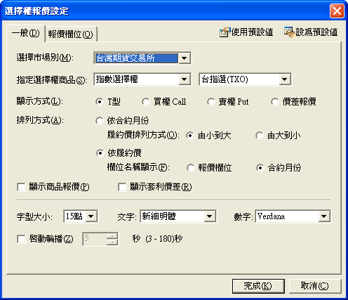 啟動輪播:若有勾選此項,表示[啟動輪播]功能,並設定輪播的速度,選擇權報價頁面會依序由上往下輪動。