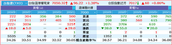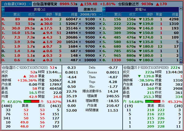 左方為買權行情表,右方為賣權行情表。